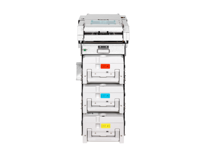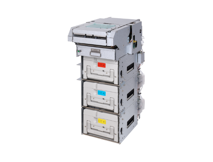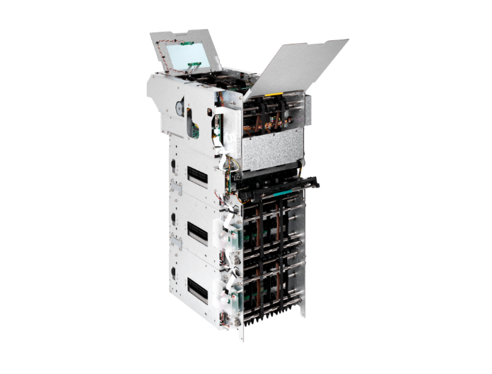 This presenter type dispenser is designed with a cassette-type and front-access structure for easy maintenance. It can hold up to 2,000 banknotes and dispenses them at a rapid speed of 4 notes per second. With a reject capacity of up to 100 notes, the system also supports cassette expansion for up to 6 denominations, allowing it to handle a variety of currencies.